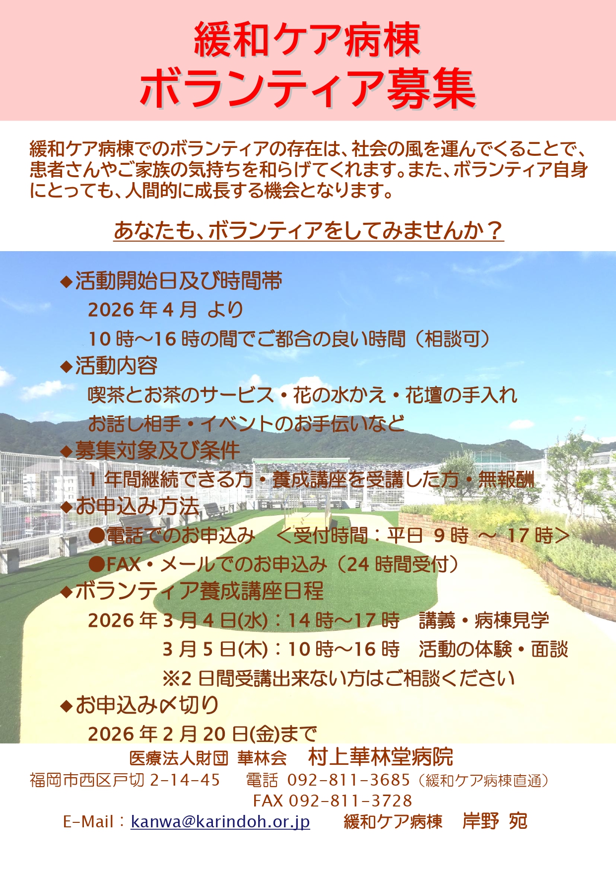 緩和ケア病棟でボランティア活動をして下さる方々を募集しています。